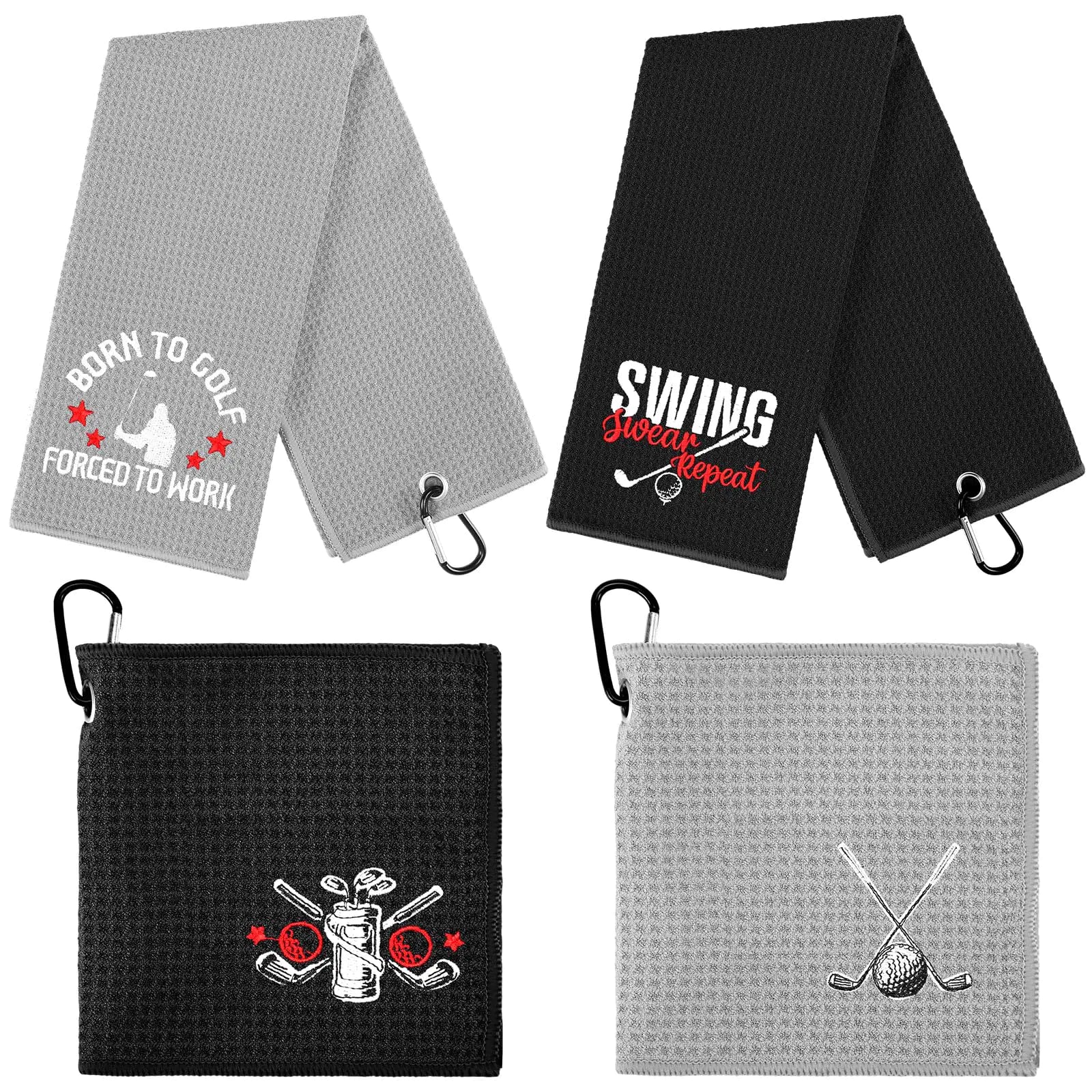 These golf towels feature a convenient mountaineering buckle, making them easy to attach to your golf bag or pants. Available in classic black and grey, they suit a variety of preferences. Made from soft microfiber, the set includes four towels in two sizes: approximately 24 x 16 inches and 12 x 6 inches.